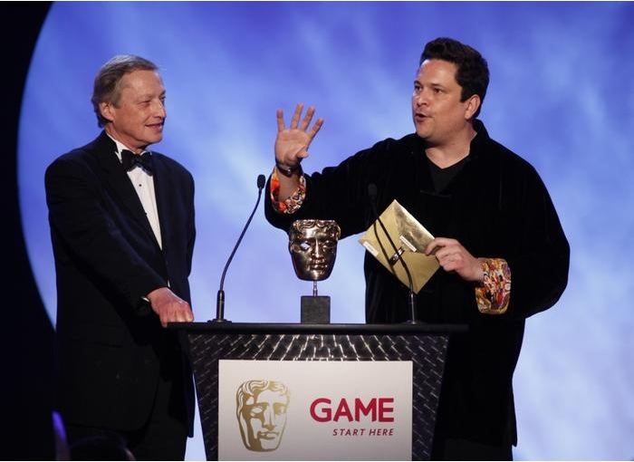 Evan Wells and Christophe Balestra, the development team behind Uncharted 2: Among Thieves, accepting the award for best Action Game (BAFTA/Brian Ritchie)